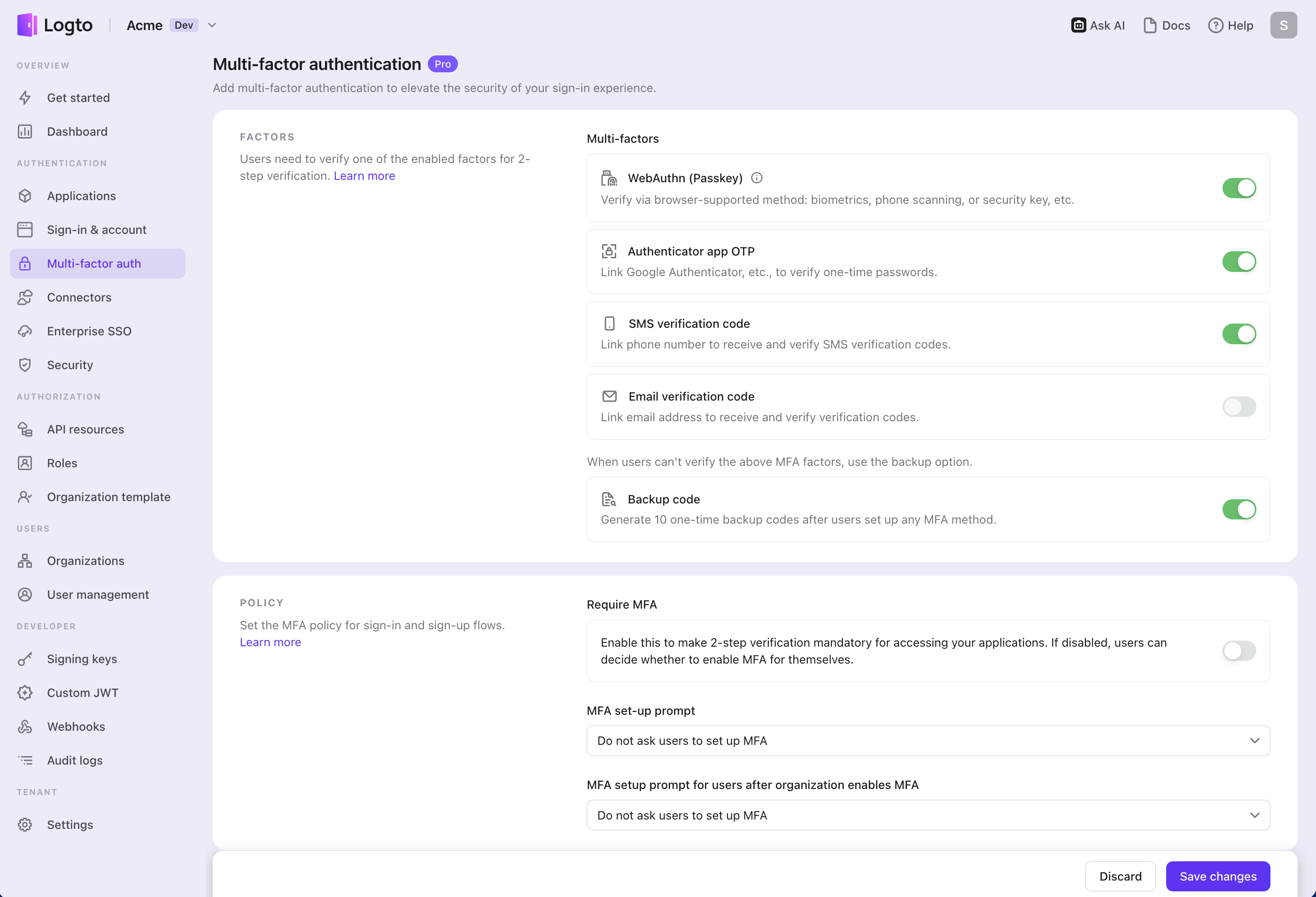 Configure MFA settings in Logto